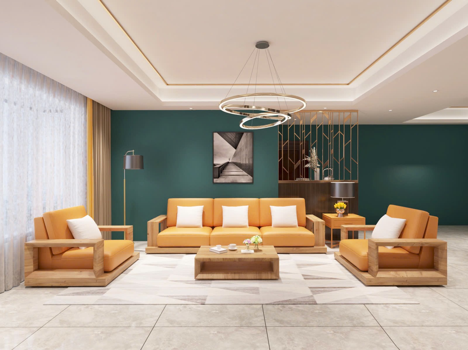 Kết hợp cùng bàn trà vân đá, đèn trang trí hoặc tủ kệ có tone đồng nhất.